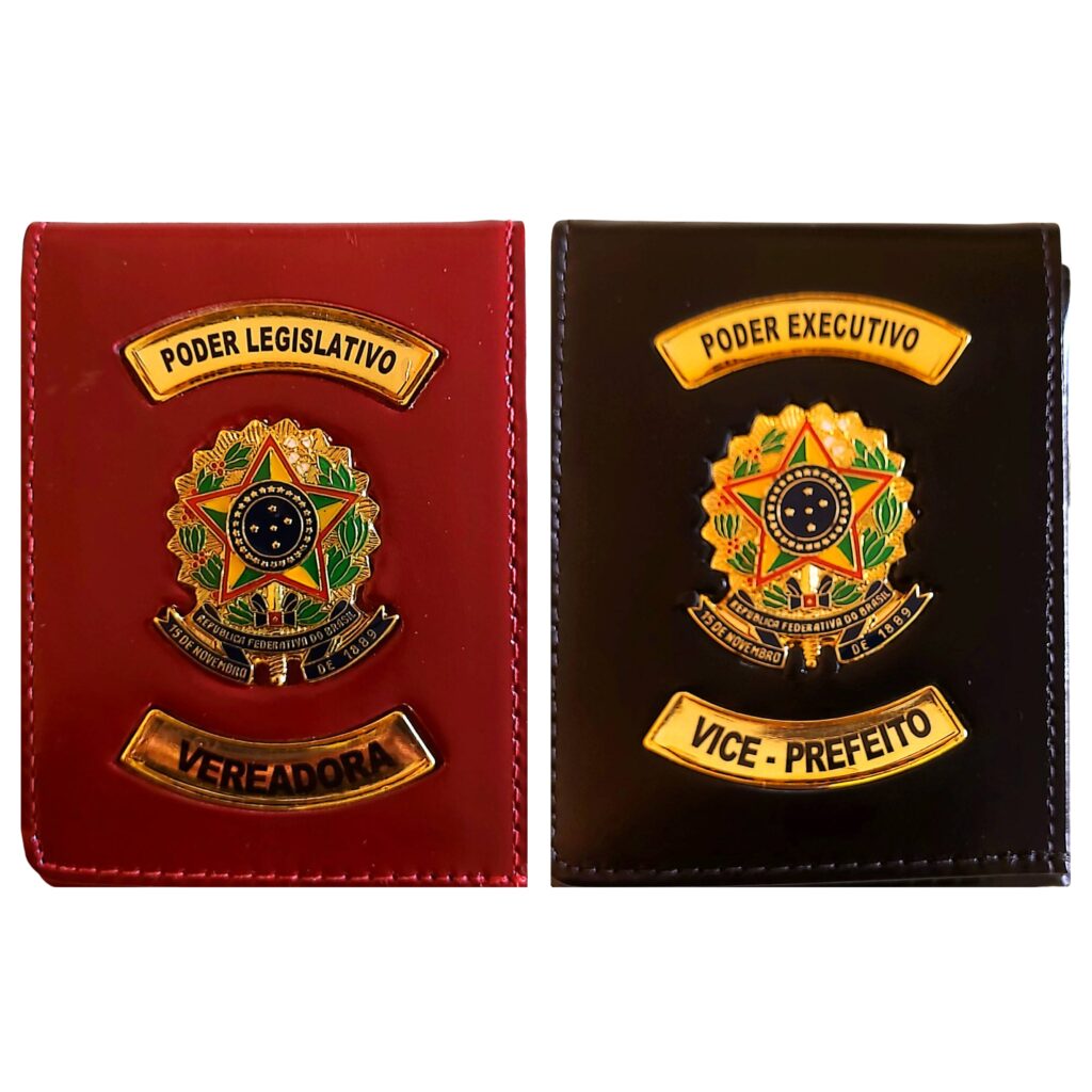 Carteira funcional preta e vermelha em couro legítimo, com acabamento de alto padrão e brasão dourado da República Federativa do Brasil. Em destaque, a insígnia do Poder